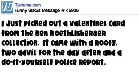 X says I just picked out a Valentines Card from the Ben Roethlisberger collection. It came with a roofy, two advil for the day after and a do-it-yourself police report..