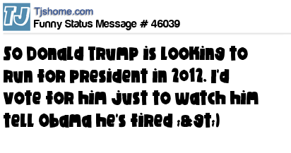 - # 45891 So Donald Trump is looking to run for president in 2012. I'd vote for him just to watch him tell Obama he's fired ;>)