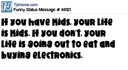 X says If you have kids, your life is kids. If you don't, your life is going out to eat and buying electronics.