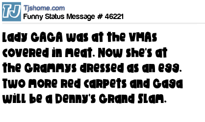 - # 46546 Lady Gaga went to the VMA's dressed as meat, now she went to the Grammy's in a egg. Two more red carpets and she will be a Denny's Grand Slam