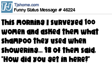 - # 149071 This morning I surveyed 100 women and asked them what shampoo they used when showering. 98 of them said, "How did you get in here?!"