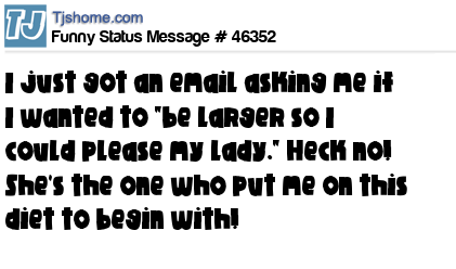 X says I just got an email asking me if I wanted to "be larger so I could please my lady." Heck no! She's the one who put me on this diet to begin with!