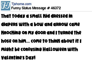 X says That today a small kid dressed in diapers with a bow and arrow came knocking on my door and I turned the hose on him.... come to think about it I might be confusing Halloween with Valentine's Day!