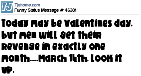 X Today may be Valentines day, but men will get their revenge in exactly one month....March 14th, look it up.