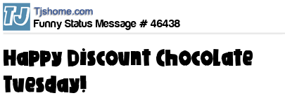 - # 46120 Instead of celebrating Valentine's Day this year, I'm celebrating Discount Chocolate Tuesday.