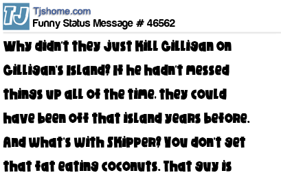- # 46539 Why didn't they just kill Gilligan on Gilligan's Island? If he hadn't screwed crap up, they could've been off that damn island years before. And what's with Skipper? You don't get that fat eating coconuts. That fat ba$tard is hiding something.