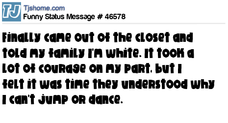 X finally came out of the closet and told my family I'm white. It took a lot of courage on my part, but I felt it was time they understood why I can't jump or dance.