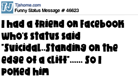 - # 11926 I have a friend whose status says: "Suicidal - Standing on the edge of a cliff". So I poked him...