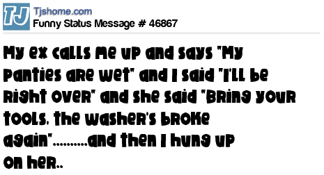 X My ex calls me up and says "My panties are wet" and I said "I'll be right over" and she said "Bring your tools, the washer's broke again"..........and then I hung up on her..