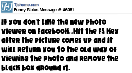 X If you don't like the new photo viewer on Facebook...Hit the F5 key after the picture comes up and it will return you to the old way of viewing the photo and remove the black box around it.