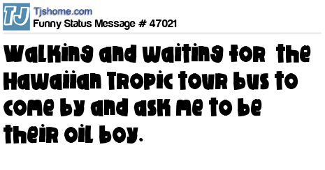 X is walking and waiting for the Hawaiian Tropic tour bus to come by and ask me to be their oil boy.