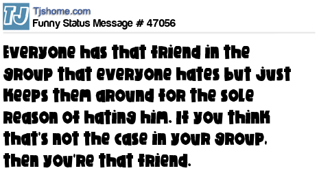 X Everyone has that friend in the group that everyone hates but just keeps them around for the sole reason of hating him. If you think that's not the case in your group, then you're that friend.