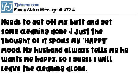 X says Needs to get off my butt and get some cleaning done :/ Just the thought of it spoils my "HAPPY" mood. My husband always tells me he wants me happy, so I guess I will leave the cleaning alone.
