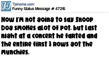 X Now I'm not going to say Snoop Dog smokes alot of pot, but last night at a concert he farted and the entire first 3 rows got the munchies.