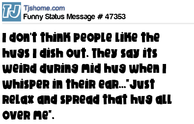 X  I don't think people like the hugs I dish out. They say its weird during mid hug when I whisper in their ear..."Just relax and spread that hug all over me".