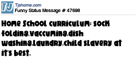 X Home School curriculum: sock folding,vaccuming,dish washing,laundry,child slavery at it's best.