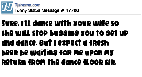 X Sure, I'll dance with your wife so she will stop bugging you to get up and dance. But I expect a fresh beer be waiting for me upon my return from the dance floor sir.