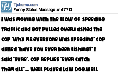 X is i was moving with the flow of speeding traffic and got pulled over,i asked the cop "why me,everyone was speeding" cop asked "have you ever been fishing?" I said "sure". cop replies "ever catch them all".... well played Law Dog,well played