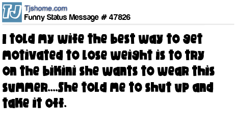 X I told my wife the best way to get motivated to lose weight is to try on the bikini she wants to wear this summer....She told me to shut up and take it off.