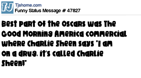 X is Best part of the Oscars was The Good Morning America commercial where Charlie Sheen says "I am on a drug, it's called Charlie Sheen!"