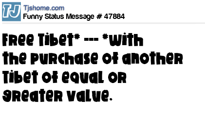 X says Free Tibet* --- *with the purchase of another Tibet of equal or greater value.