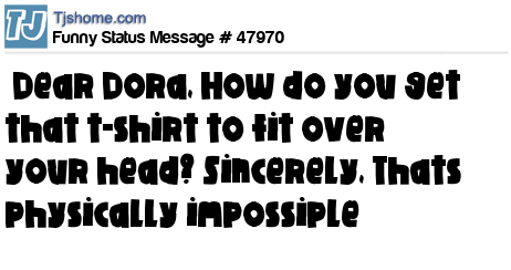 - # 48103 Dear Dora, How do you get that t-shirt to fit over your head? Please tell me your secret because I would like to fit into these size 5 jeans. Sincerely, The Average Sized Woman