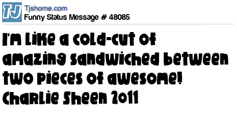 - # 48188 I'm like a cold-cut of amazing sandwiched between two pieces of awesome! Charlie Sheen....I think I wanna marry that crazy Ba*tard, if nothing else having a conversation with him would be AWESOME!