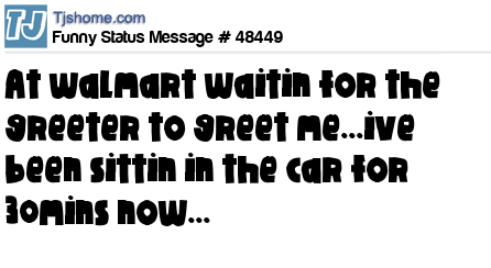 X is at walmart waitin for the greeter to greet me...ive been sittin in the car for 30mins now...