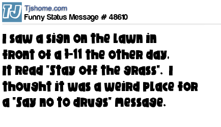 X I saw a sign on the lawn in front of a 7-11 the other day, It read "Stay off the grass". I thought it was a weird place for a "Say no to drugs" message.