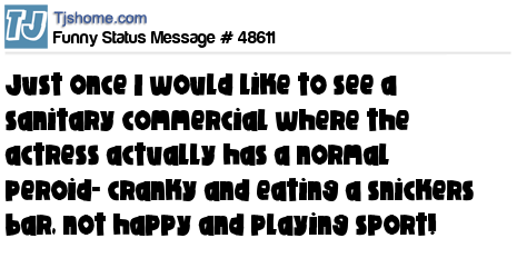 X Just once I would like to see a sanitary commercial where the actress actually has a normal peroid- cranky and eating a snickers bar, not happy and playing sport!