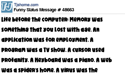 - # 33756 Life before the computer: Memory was something that you lost with age. An application was for employment. A program was a TV show. A cursor used profanity. A keyboard was a piano. A web was a spider's home. A virus was the flu. A CD was a bank account. A