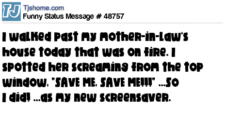 X i walked past my mother-in-law's house today that was on fire. I spotted her screaming from the top window, "SAVE ME, SAVE ME!!!" ...So I did! ...as my new screensaver.