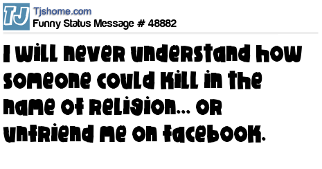 X I will never understand how someone could kill in the name of religion... or unfriend me on facebook.