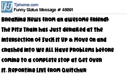 X says Breaking News from an awesome friend!: The Pity Train has just derailed at the intersection of Suck It Up & Move On and crashed into We All Have Problems before coming to a complete stop at Get Over It. Reporting LIVE from Quitchur Yapping, USA. :P