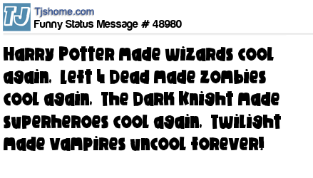 X is Harry Potter made wizards cool again, Left 4 Dead made zombies cool again, The Dark Knight made superheroes cool again, Twilight made vampires uncool forever!