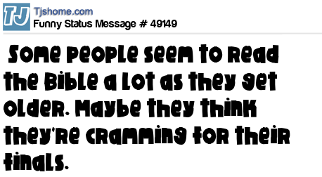 - # 22036 I was thinking about how people seem to read the Bible a whole lot more as they get older, then it dawned on me -- they were cramming for their finals!