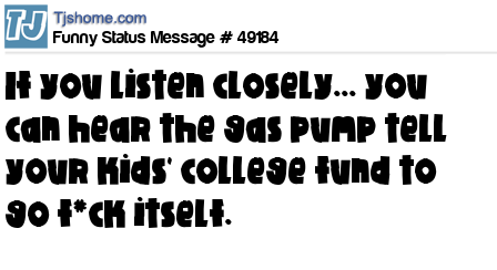 - # 49200 While pumping gas, if you listen closely, you can hear the pump telling your kid's college fund to go "F" itself.