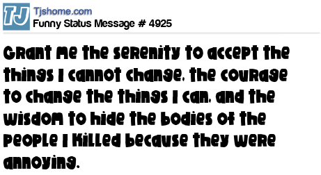 - # 14510 God, grant me the serenity to accept the things I cannot change, the courage to change the things I can, and the wisdom to hide the bodies of the people I had to kill because they ate all my oreos and were always peeing on my toilet seat.