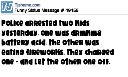 - # 22838 Police arrested two kids yesterday, one was drinking battery acid, the other was eating fireworks. They charged one and let the other one off...