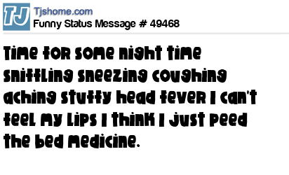 - # 33078 Time for some nighttime sniffling sneezing coughing aching stuffy head fever I can't feel my lips I think I just peed the bed medicine.