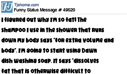 - # 48028 I figured out why I'm fat! The shampoo I use in the shower that runs down my body says "For Extra Volume and Body". I'm going to start using Dawn dish soap. It says "Dissolves fat that is otherwise difficult to remove".