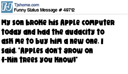 X My son broke his Apple computer today and had the audacity to ask me to buy him a new one. I said, "Apples don't grow on f-kin trees you know!"