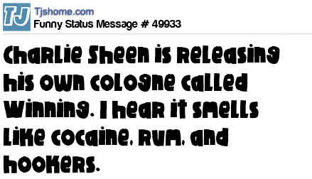 X is Charlie Sheen is releasing his own cologne called Winning. I hear it smells like cocaine, rum, and hookers.
