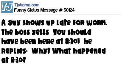 - # 79664 I showed up late for work today . The boss yells "You should have been here at 8:30!" ,,, I replied "Why? What happened at 8:30?"