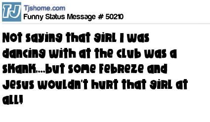 X is not saying that girl I was dancing with at the club was a skank,...but some Febreze and Jesus wouldn't hurt that girl at all!