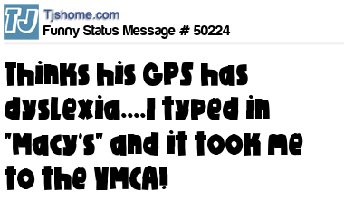 X thinks his GPS has dyslexia....I typed in "Macy's" and it took me to the YMCA!