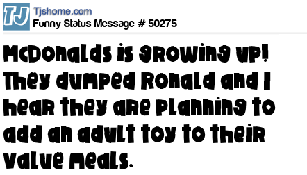X is McDonalds is growing up! They dumped Ronald and I hear they are planning to add an adult toy to their value meals.