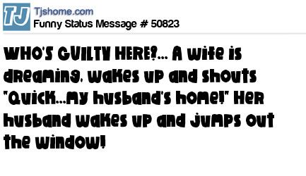 - # 17344 WHO's GUILTY?Husband n Wife r sleeping. Wife dreamin at nite suddenly shouts "Quick my husband is back". Husband gets up & jumps out of d window!