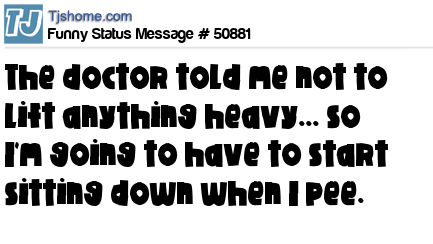 - # 94987 My doctor told me not to lift anything heavy for a few weeks. So I have to sit when I pee now.