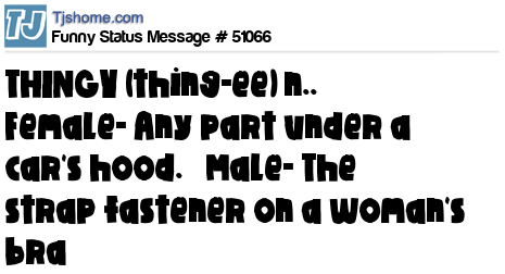 X says THINGY (thing-ee) n.. Female- Any part under a car's hood. Male- The strap fastener on a woman's bra